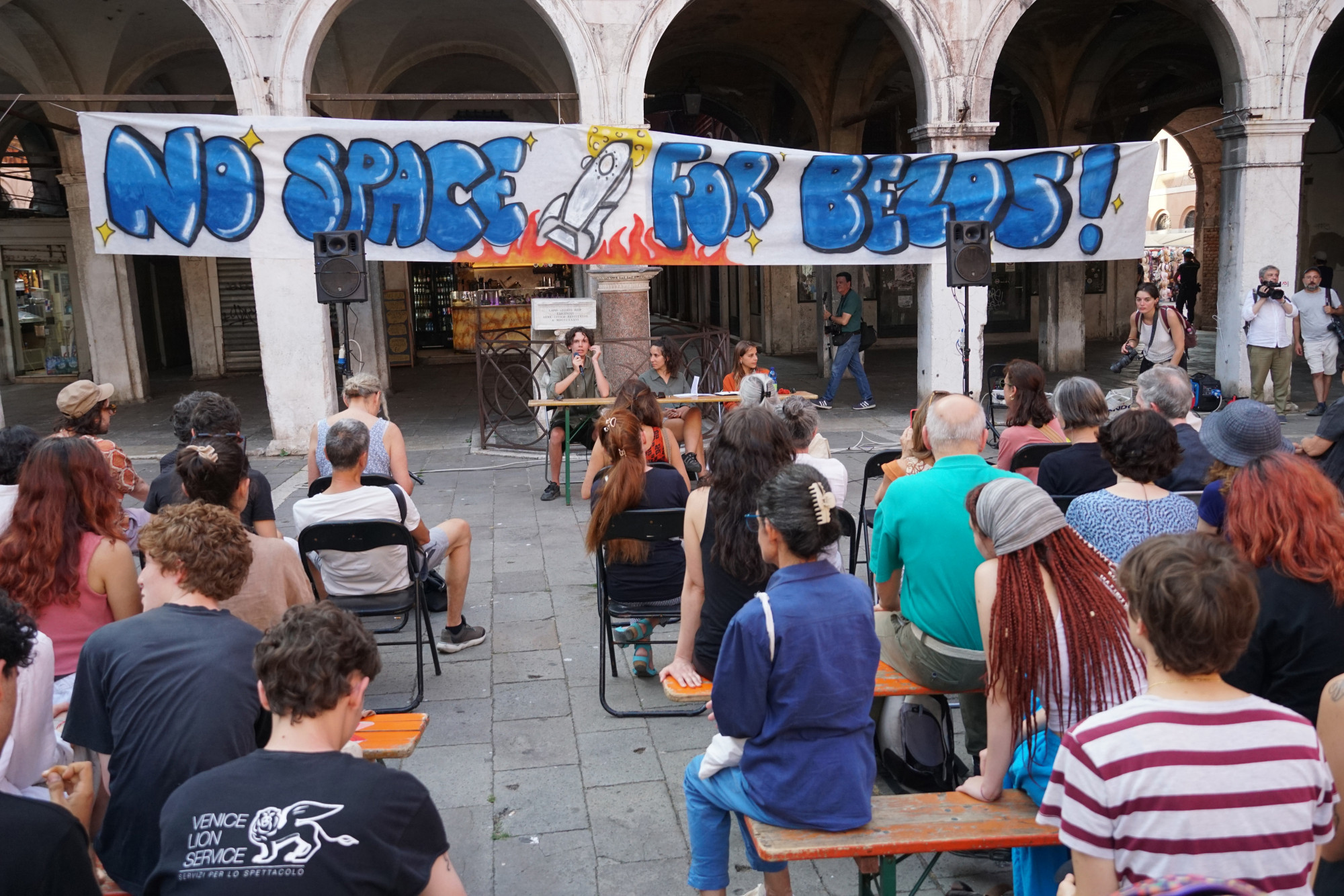 Активисти од движењето „Нема место за Безос“ на протест во Венеција во пресрет на раскошната свадба вредна 20 милиони долари.| Andrea Merola/Bloomberg