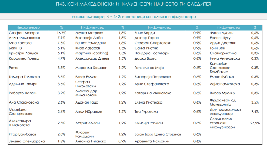 Најследен инфлуенсер е македонскиот водител, музичар, јутјубер и поткастер Стефан Лазаров. Со 16,7 проценти тој ужива дури двојно поголема доверба од ТВ-водителката Лила Филиповска (7,9 проценти) и поранешната водителка Миа Костова (7,3 проценти) кои се најдоа на второто и на третото место. Листата со петте најследени личности кај нас на социјалните мрежи и на дигиталните платформи ја заокружуваат македонскиот шоумен и поранешен осуденик Бојан Јовановски, во јавноста познат како Боки 13, и новинарот Кристијан Ландов кои во периодот од 27 декември 2025 година до 25 јануари 2026 година кога е спроведено истражувањето биле подеднакво влијателни со 6,1 проценти.