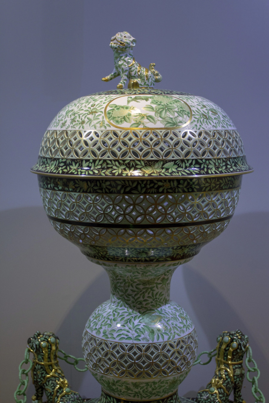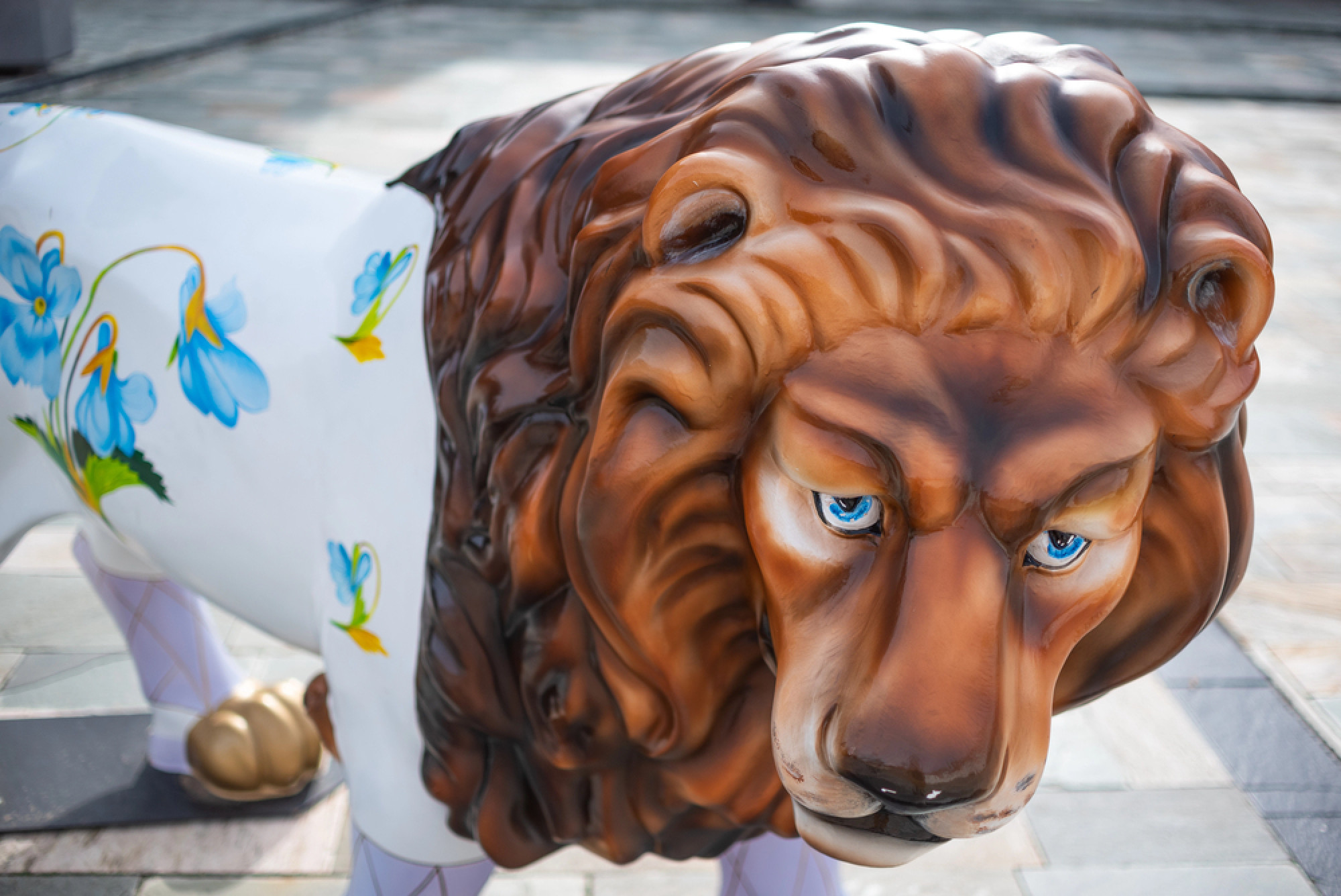 Порцеланска фигура на лав во природна големина на влезот во Музејот на порцеланот „херенд“ /Depositphotos