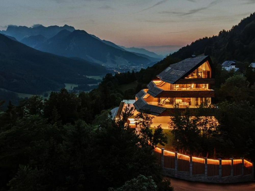 Ентериерот е заснован на природни материјали: масивно дрво, камен и меки текстури, кои создаваат чувство на топлина и безвременост. Панорамските стаклени површини отвораат погледи кон снежните врвови на Јулиските Алпи и ја бришат границата меѓу внатрешниот простор и природата, која дури и во зима станува неразделен дел од престојот.