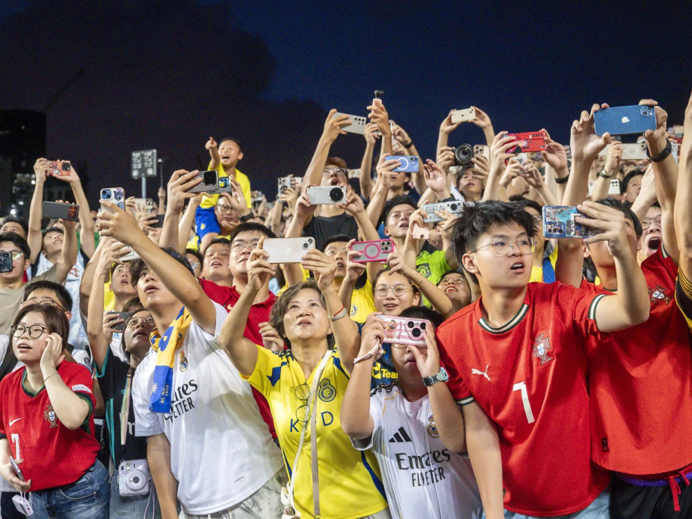 Обожаватели на Роналдо го фотографираат својот идол пред финалето на Суперкупот на Саудиска Арабија меѓу Ал Наср и Ал Ахли на стадионот во Хонгконг, на 23 август. Фотограф: Евроазија спорт имиџис / Гети имиџис