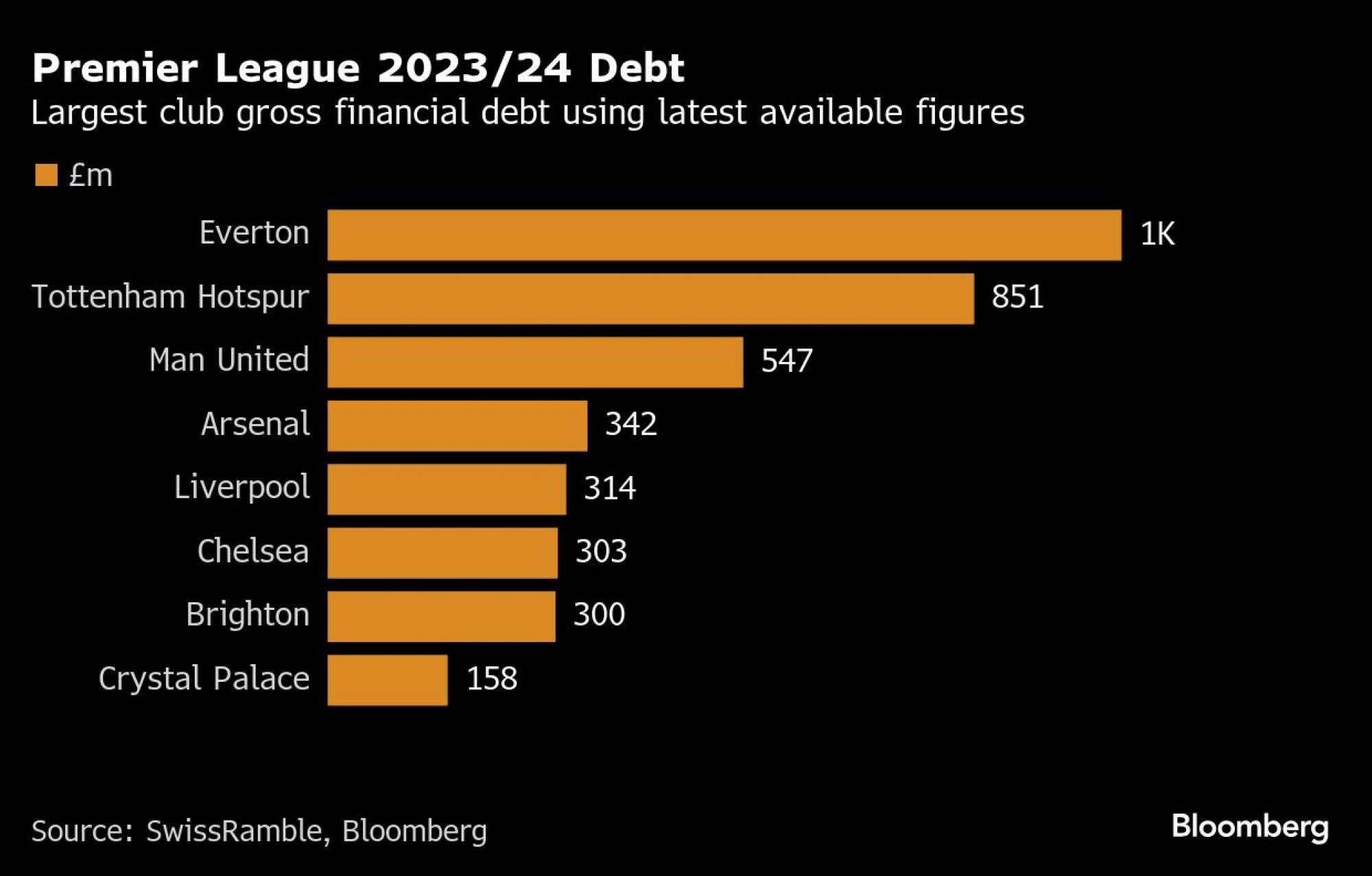 Клубовите од Премиерлигата сè повеќе прибегнуваат кон задолжување откако во летниот преоден рок потрошија рекордни три милијарди фунти (четири милијарди долари) за нови засилувања. Трансферните надоместоци за врвни фудбалери сега редовно ја надминуваат границата од 100 милиони фунти, а голем број клубови планираат и проекти за реконструкција на стадионите.
