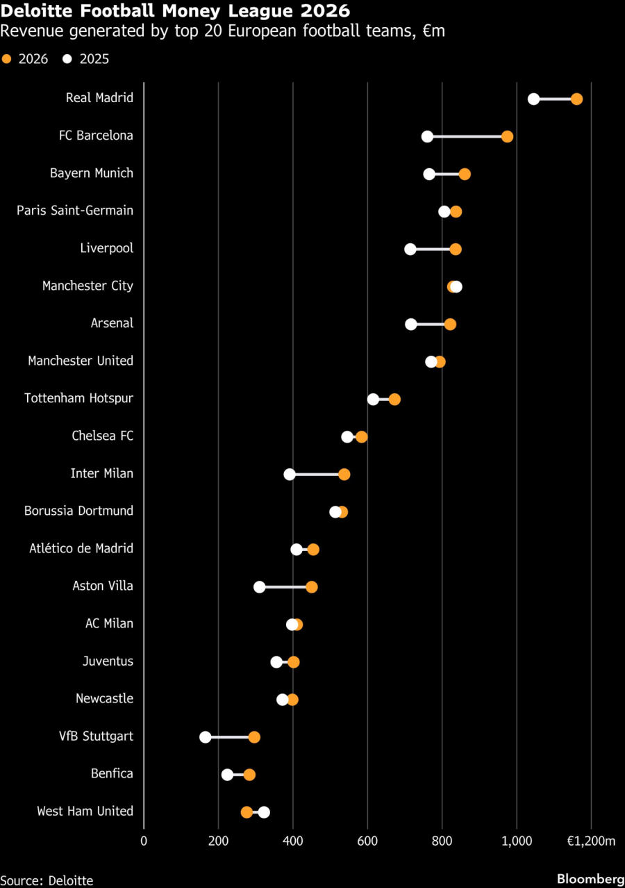 Значајните приходи генерирани од правата за емитување на Премиерлигата, особено на меѓународните пазари, сепак доведоа до тоа англиските клубови да ја пополнат долната половина од десетте глобално најголеми генератори на приходи.